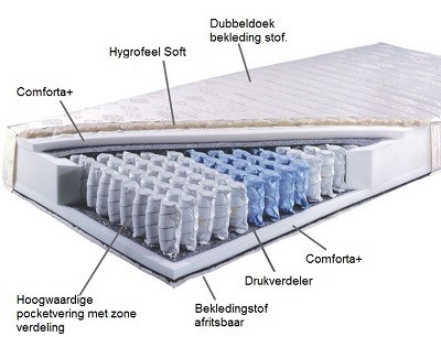Dit is het originele Princess Pocket matras, ontwikkeld en gemaakt door Nederlands meest toonaangevende matrassenfabriek. De comforta+ is een zeer goede Nederlandse schuimsoort. De stevige middenzone en diverse andere zones zorgen in combinatie met de goed ventilerende afdeklaag van comforta+laag, voor een aangenaam goed ondersteunend matras.